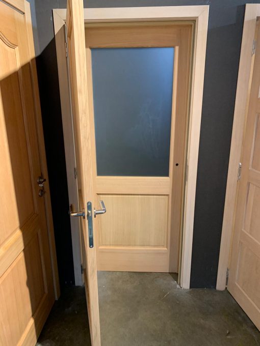 Moulura eiken stijldeur met mat veiligheidsglas. Deze deur werd geselecteerd om haar eenvoud van installatie, eenvoud van onderhoud & milieuvriendelijkheid. Deze deur is opgebouwd uit een kader in massief eiken, verstevigd ter hoogte van het slot met een voorgevormde, in eik gefineerde MDF dekplaat. Mat glas is inbegrepen en reeds geplaatst in het deurblad.