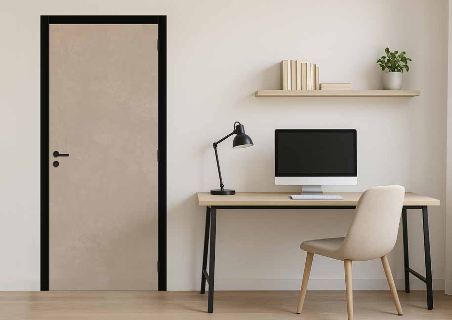 Imitaties van beton en metaal worden steeds belangrijker. Deze binnendeur heeft de gewenste authenticiteit en uitstraling door de juiste oppervlaktestructuur.