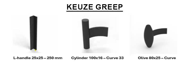• Keuze uit 3 deurgrepen : Cylinder 100×16 (of) L-handle 25×25 – 250mm (of) Olive 80×25