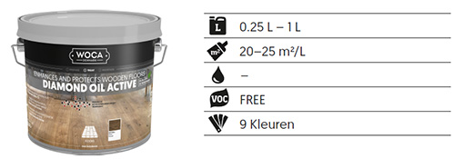 WOCA Diamond Oil Active is een 1-component, geurarme en extreem slijtvaste olie, gemaakt van grondstoffen van hoge kwaliteit. De olie is waterafstotend, eenvoudig te verwerken en zorgt voor veel minder productafval.